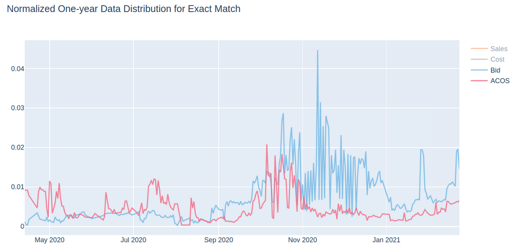 The data covers from April 2020 to February 2021, and are Min-Max normalized. The Sales changes significantly, especially after Sept 2020. Bid Price increases since Oct 2020. Please note there can be some bias caused by the currency rate due to many Japanese clients. It shows the ACOS does not vary very much, compared with Sales. Since ACOS = Cost/ Sales, it eliminates the impact of the currency rate naturally, it is only biased by the regional market condition. From ACOS, we find there is a peak region between Oct to Nov 2020, indicating the ad campaign works well at that time period, with less cost but more sales. The reason behind that might because of clients, or because of the market.
